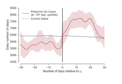 Esta semana se ha publicado el primer estudio que mide las consecuencias de la aparición de Pokemon GO (aquí puede ver el artículo completo). Los autores midieron la actividad física (cuantificada como pasos) de miles de personas y compararon a los usuarios del juego con los que no lo eran.